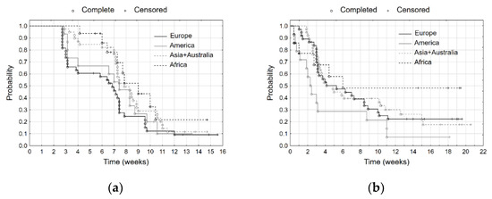 We used a cohort of 108 of the most important stock market indices. They are presented in Table A1 in Appendix A. We observed the values of the indices from mid-December 2019 until 15 July 2020. We analysed the two phenomena—decline in the value of the indices and then their increase. In the case of the first one, we analysed 20% decline in the value of the indices from their maximal value. For these reasons, we observed the stock exchange indices from mid-December 2019 to mid-April 2020 (4 months). We considered the moment when the analysed index reached its maximum during the observation period as an initial event. The moment when the index recorded a 20% decline from its maximal value, we considered as the final event. In such a case, the random variable T was the time that elapsed between the initial and the final event. The next analysed phenomenon was the 20% increase in the values of the indices. In this case, the random variable T was the time that elapsed from the minimum value (initial event) until the moment of reaching the 20% increase of the value (final event). Due to the process of the spreading the pandemic, we grouped the indices by continents. By doing this, we selected four groups of indices: European, American, African, and Asian plus Australian ones. Because of the fact that we analysed only three indices for Australia and New Zealand, we decided to add them to the Asian ones. In the analysed period, not all the indices have reached the assumed limit values. These are the censored observations. Table 1 presents the share of indices for each group that reached at least a 20% decline in their values, a 20% increase, and those that did not reach the assumed limit values. Additionally, Table 1 presents maximal and minimal times of decline and increase in values of the indices. The first required decline took place on the 19th day since maximal value (in Europe) and the last one—on the 84th day (also in Europe). Twenty percent of indices did not record the required decline in their values—the largest number of them was in Africa (44%). The first required increase took place on the third day after the minimal value (in America and Africa) and the last one—on the 106th day (Asia + Australia). Thirty percent of indices did not record the required 20% increase in their values. Furthermore, in this case, the largest share of them was in Africa.