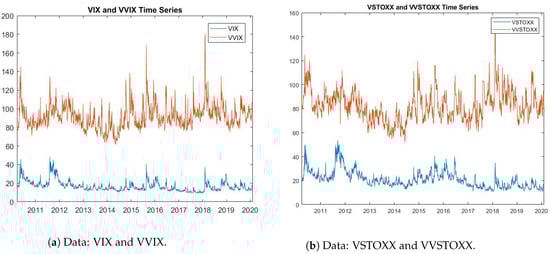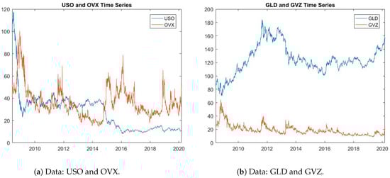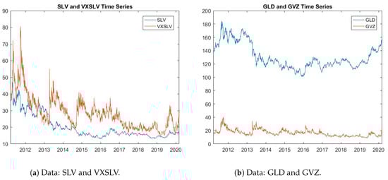 We consider the following pairs of assets and volatilities: The first study is on VIX (S&P 500 Volatility Index) and VSTOXX (Euro STOXX 50 Volatility Index); here, we also use the volatility indexes VVIX and VVSTOXX, respectively. The second group is comprised of USO (Oil ETF) and GLD (Gold ETF), with OVX and GVZ as the respective volatility indexes. The third and final group is made up of SLV (Silver ETF) and GLD, with VXSLV and GVZ as the respective volatility indexes. All these data sets are daily in the period from late 2010 to early 2020.