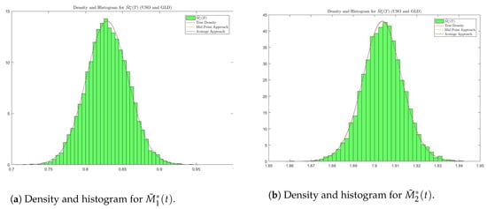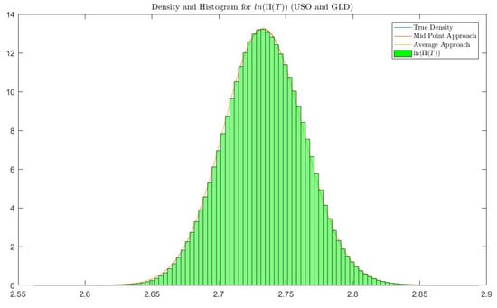 If X and Y have analytical density functions, then the convolution method is straightforward. In our case, we obtain the conditional c.f. first. The Fourier inversion of the conditional c.f. theoretically gives the density function. However, due to the structure of our original c.f. and the approximations, we need to invert both the original c.f. and the approximated c.f.s numerically for the corresponding density functions. For and , we can obtain their conditional corresponding density functions and by inverting the c.f. of and :