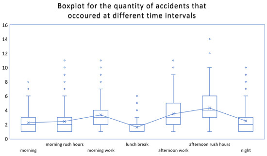 Box plots of the frequency of accidents that occurred at the different time intervals (according to the TIME field of Table 3).