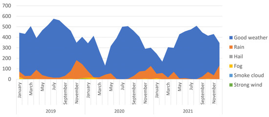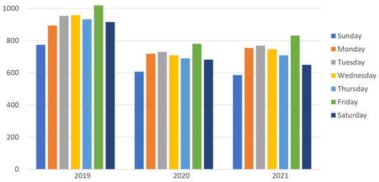 Figure 3 shows that the day of the week with more accidents than any other is Friday (that is the day of the week when most traffic congestion occurs [46]), and the days with the fewest accidents are Saturday and Sunday.