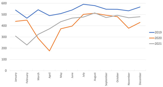 Number of monthly accidents before COVID-19 (2019) and during the COVID-19 pandemic (2020 and 2021).