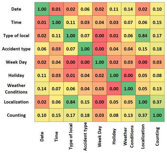In Figure 5 we can see that, in the variable “counting”, which represents the accident count, the variables with the highest correlation are the time of day, the type of place, the location, and the meteorological factors. The type of accident, which here represents its severity, was considered only to be verified if there was a correlation between the severity of the accident and the number of accidents that occurred; this is confirmed, since there is a low correlation of 0.18 for this pair of variables.