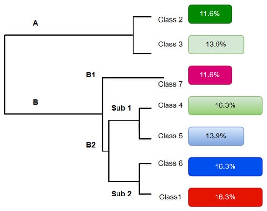 The TSs were analyzed using the Descending Hierarchical Classification (DHC), based on vocabularies and separated according to the frequency of reduced forms (i.e., all similar words, words with the same semantic meaning, or words that appear in both singular and plural forms were reduced to simple words). This analysis was carried out by cross-referencing (in matrices) the TS and words based on the Chi-square distribution (), organized by classes in an illustrative DHC dendrogram for the contextualization and interpretation of each class [50]. The contents are presented in tables for each class of meaning, to consider the identification of the word (form), the grammatical class in which the word was identified in the software’s dictionary of forms (type), the number of TSs that contain the word in the class (eff. s.t.), the number of TSs in the corpus that contains the cited word at least once (eff. Total), the percentage (%), the chi-square (), and the level of significance of the association of the word with the class (α).