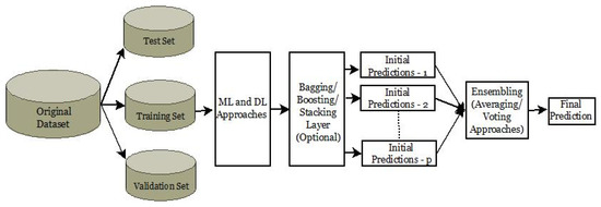 Ensemble learning (EL) improves the predictive analysis performance and accuracy [33]. The ML and DNN use ensemble approaches, such as bagging, voting, and averaging, to distribute data to worker nodes and obtain insights, as shown in Figure 2. The bootstrap aggregator, commonly known as the bagging meta-estimator, is an EL approach that may be used for classification and regression (BaggingClassifier and BaggingRegressor), whereas averaging averages, as in Equation (6), where WA() is a function representing weighted averaging on p number of initial predictions and weights assigned , all predictions for a final predictive result and voting use an ensemble of various models to train and predict an output based on the class that has the highest likelihood of becoming the output.