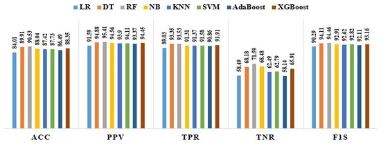 Owing to the difficulty in diagnosing and predicting illnesses, artificial intelligence (AI) and its extensions, such as machine learning (ML) and deep learning (DL), are essential tools for empowering diabetic patients and doctors in their daily lives [30]. Logistic regression (LR) is a statistical method for predicting the link between a binary dependent variable and at least one of the independent variables, such as probabilities and sigmoid function. A decision tree (DT) creates a set of rules that can be used to classify data using the idea of decision making. Random forest (RF) is applied to reduce overfitting and improve prediction accuracy. Naive Bayes (NB) performs well under many actual circumstances, including document classification and spam filtering. K-Nearest Neighbors (KNN) is a technique for finding solutions to classification and regression problems; however, in the business sector, it is most typically used for classification challenges. In multidimensional space, a support vector machine (SVM) is used to classify data points using the proper hyperplane. AdaBoost, or adaptive boosting, is a statistical data classification algorithm. Extreme gradient boosting (XGBoost) is an ensemble machine-learning technique based on gradient boosting that uses decision trees. XGBoost performed better than AdaBoost because of system upgrades.