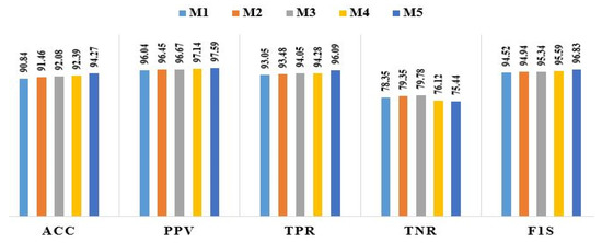 In this study, we first considered eight fundamental ML techniques: LR, DT, RF, NB, KNN, SVM, AdaBoost, and XGBoost. Initial predictions were created, and they are listed in Table 6 and displayed in Figure 6. However, the highest accuracy achieved among the ML techniques (i.e., with RF) was only 90.53%, which can be improved by combining these results using weighted averaging, soft voting, and hard voting, which are models known as M1, M2, and M3, respectively. When there are more instances in the datasets, it seems wise to use the DL approach, DNN, and bagging classifiers with weighted averaging and hard voting ensemble techniques, whose models, known as M4 and M5, respectively, are used in numerous experiments. According to reports based on performance measurements, model M5, that is, the DNN with bagging and hard voting classifiers, as shown in Table 7 and Figure 7, surpasses all other recommended models and is deemed to be the proposed DBM approach.