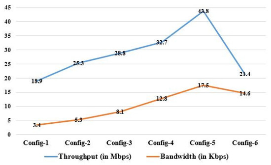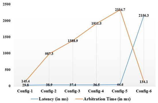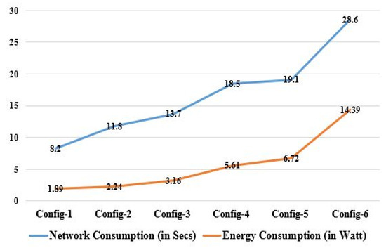 The network parameters latency, arbitration time, total processing time, throughput, energy consumption, bandwidth, jitter, network utilization, and scalability were used to validate the proposed task. The various configurations considered for measuring network characteristics are Config-1 for the MBP only, Config-2 for the MBP with one FWN, Config-3 for the MBP with two FWNs, Config-4 for the MBP with three FWNs, Config-5 for the MBP with four FWNs, and Config-6 for the CCN only. Equation (23) can be used to express “latency (LT),” which is the length of time it consumes for data to move through a network and for a packet to be received, transmitted, and decoded at its destination. Arbitration time (AT) is the window of time during which the MBP must respond to GTDs, which may change according to the setup. The processing time (PT), which varies depending on the setup, is the period of time between starting a job, processing it, and returning user responses. The temporal time delay of a signal’s time change is known as the jitter (JT). Task response times may vary, and this is known as jitter. It is a crucial measurement that may be expressed in Equation (24) for many real-world applications, such as the analysis of data from e-healthcare. The quantity processed in a given time, such as the number of HTTP communications per day or bits transported per second, is known as throughput (TP). It can be calculated using Equation (25) to regulate the rate at which data packets are effectively transferred from any node to end nodes. The average data transfer rate over a communication path is known as network consumption or NC. Compared to cloud computing, Fog computing requires fewer networks. The system’s overall energy use was measured as energy consumption (EC). Energy is used by the sensors, Fog nodes, and other components. Equation (26) and the physical theorem both measure and compute this in terms of Watt (W). Table 8 presents the observed findings for various network parameters corresponding to various setups.