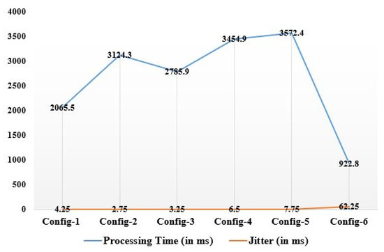 Figure 8 displays the observed latencies versus arbitration time over the configurations, where the latency is determined by adding the transmission and queue times. Every job submitted to the MBP or FWNs uses single-hop data transmissions; hence, the latency is the same. Owing to multi-hop data transmission outside the network, cloud latency is considerable; hence, FC is required. However, arbitration time is shorter when jobs are routed to the MBP or CCNs. In other instances, the load balancing affects the arbitration rate. Owing to enhanced processing, cloud processing is fast. Figure 9 shows the observed processing time versus jitter for the configurations. The amount of time it takes to begin, complete, and return a job to the users is known as the processing time. It is possible to observe that the overall processing time is significantly reduced when using cloud communications since cloud processing is extraordinarily quick owing to its higher capabilities. Because the nodes in FWNs have less processing power and a lower clock frequency, processing takes longer in cases when Fog computing infrastructures are used, whereas cloud communication has a shorter processing time. It shows a jitter with different settings, as shown in Figure 9. Jitter is stronger in the MBP-alone condition than when tasks are transferred to FWNs because the MBP handles arbitration, security checking, and resource management, whereas jitter is higher when jobs are supplied to the CCN.
