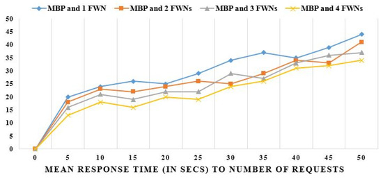 Scalability is the IoT-Fog-Cloud system’s ability to increase software service delivery by augmenting software service resources when demand varies [35,36]. As shown in Figure 12, our key concern is whether the system can grow in quantity (scalability) over a long period when customers require it. The average response time increased in proportion to the number of queries sent, although this increase was not exponential. The research is scalable because response times do not fluctuate with an increase in queries.