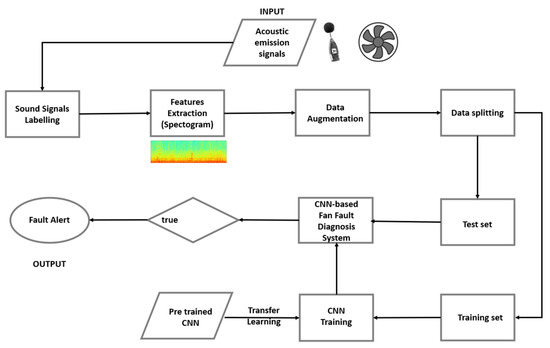 The modern conception of industrial production recognizes the increasingly crucial role of maintenance. Currently, maintenance is thought of as a service that aims to maintain the efficiency of equipment and systems while also taking quality, energy efficiency, and safety requirements into consideration. In this study, a new methodology for automating the fan maintenance procedures was developed. An approach based on the recording of the acoustic emission and the failure diagnosis using deep learning was evaluated for the detection of dust deposits on the blades of an axial fan. Two operating conditions have been foreseen: No-Fault, and Fault. In the No-Fault condition, the fan blades are perfectly clean while in the Fault condition, deposits of material have been artificially created. Utilizing a pre-trained network (SqueezeNet) built on the ImageNet dataset, the acquired data were used to build an algorithm based on convolutional neural networks (CNN). The transfer learning applied to the images of the spectrograms extracted from the recordings of the acoustic emission of the fan, in the two operating conditions, returned excellent results (accuracy = 0.95), confirming the excellent performance of the methodology.