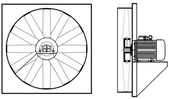Fans are classified into two main types, depending on their construction design: centrifugal and axial fans. In the axial fans (Figure 2) the air flow passes through the fan blades essentially in a direction parallel to the rotation axis of the impeller, keeping the average flow direction unchanged, despite the onset of whirling phenomena due to the rotation of the blades. The major component of the force applied by the blades is in the axial direction from the inlet to the outlet, which causes an increase in pressure. The main characteristics of an axial fan strongly depend on the number of blades and on the angle of these with respect to the flow. These fans are more suitable for situations with a high ratio between flow and pressure.