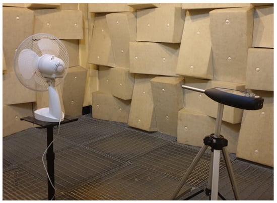 Acoustic tests were made in an anechoic chamber (4.40 m 4.40 m 4.50 m) for each of the two designs, with fiber-glass absorbing wedges and a cutoff frequency of 100 Hz: Consequently, there is a large reduction in the signals’ reflection off of the walls (Figure 3). This method of measurement has no issues in the case of rotating blades because it does not necessitate physical contact between the sensor and the moving object, as is necessary for the detection of vibrations. The fan was positioned in the center of the anechoic chamber to produce a fixed source-receiver system, eliminate positioning error, and achieve good signal capture in order to simulate the operational conditions.