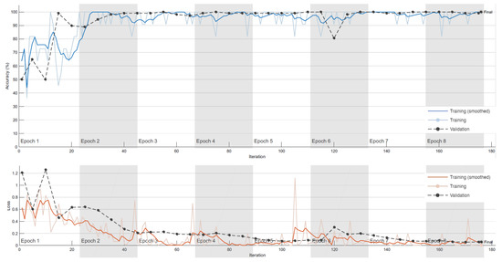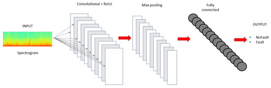 A classifier based on CNNs was fed with the retrieved features (spectrogram of the two operating conditions) as input: due to their ability to recognize adjacency patterns through adaptive learning that progresses from the bottom level to the top level, CNNs have proven successful at characterizing data with a grid topology. They are highly helpful for object recognition in computer vision thanks to their characteristics [62]. The CNNs operate on raster images characterized by two-dimensional arrays in which each pixel assumes values in the range of 0 to 255: the adjacent pixels are interlaced with each other in defining a pattern that the CNNs associate with the weights of the network.