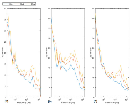 Spectral levels in a range spanning a third of an octave, 20 Hz to 16 kHz, for the three operating scenarios used in the measurement session at the three microphone placements (dB Lin). ((a): 180°, (b): 270°, (c): 360°).