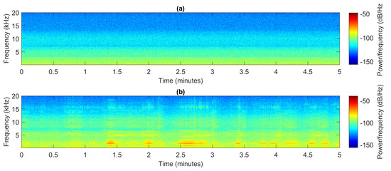 A frequency domain study is necessary because ambient noise exhibits a wide variety of frequencies at various levels. The results of the frequency analysis are the energy levels in the various frequency bands, or the so-called signal spectrum, which is a Cartesian diagram of the sound’s frequencies in relation to its energy content [60]. The signals detected by the operation of the fan in the anechoic chamber were previously treated for the extraction of the characteristics. The choice fell on the spectrogram which relates three essential variables in the representation of a sound: frequency, time, and intensity of the signal. To show these three variables in a two-dimensional diagram, a color map is used: Time is measured by the abscissa, frequency by the ordinate, and sound intensity by colors [61]. Dark colors on the color map denote low sound intensity, while light colors denote high sound intensity [61]. Dark colors on the color map denote low sound intensity, while light colors denote high sound intensity. To define the acoustic emission of the fan and find specific trends capable of differentiating between the two activities, it is important to employ the spectrogram to emphasize the instances of time in which frequency fluctuations occur.