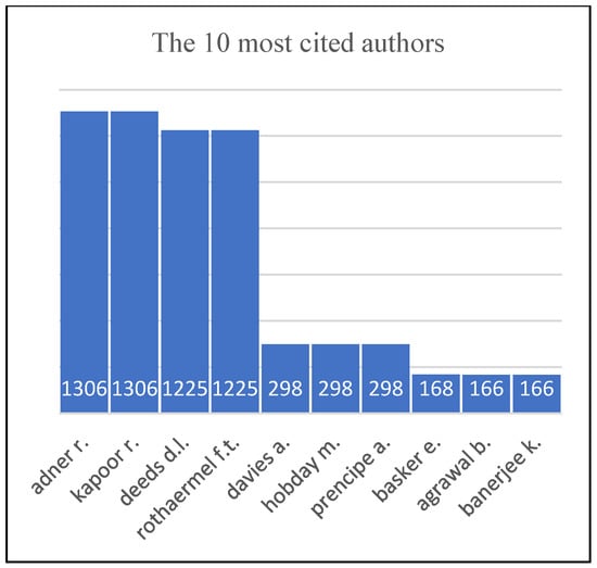 Similarly, in Figure 4, the existence of pairs of names with the same number of citations is observable. This is due to the fact that the authors of the articles are the same: standing out in this matter are the authors Adner and Kapoor, who with the writing of the scientific article “Value creation in innovation ecosystems: How the structure of technological interdependence affects firm performance in new technology generations”, reached 1306 citations.