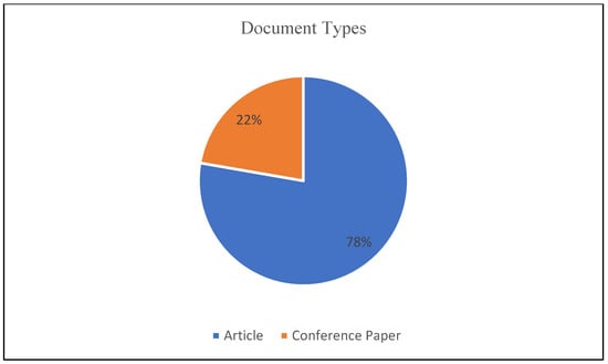 Figure 7 shows that of the total of 238 documents (representing the final sample), more than 2/3 represent scientific articles (78%), which reinforces the idea that the scientific literature values this theme. A total of 22% of the documents correspond to conferences, accounting for a total of 53 conferences present in this study.