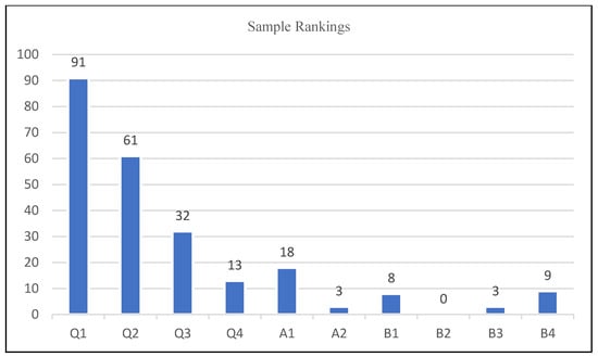 With regard to the analysis of the quality of the articles, we used the Scimago tool, which allowed us to find the ranking of the scientific articles, based on the impact factor (IF) data, and the results are presented in quartiles. The first (Q1) assumes greater relevance (top 25% of the IF); the second (Q2) assumes great relevance corresponding to an average position, between the top 50% and 75%; the third (Q3) assumes less thematic relevance, obtaining a low average position, between 25% and 50%; and finally, the fourth (Q4) assumes even less thematic relevance, corresponding to a lower position, among the 25% of articles with lower impact of the IF distribution. Complementarily, taking into account that our final sample included conferences, which are not possible to analyze the ranking through the Scimago tool, we resorted to exploring the Conference Ranks website, which through its criteria classifies the conferences from A to C (A—excellent, conference of major relevance in the area; B—good to very good, conferences with great consideration in the area; C—satisfactory and solid). Figure 8 shows the distribution of the quality assessment of the articles in our final sample. The results obtained were satisfactory. It should be noted that approximately 73% of the final sample is between Q1 and Q2 (Scimago criteria), and in the case of conferences, between A1 and A2 (conference ranks). The remaining 27% represent the documents in the boundaries Q3 and Q4 (Scimago criteria), B1 to B4 (conference ranks). A reduced percentage of documents in the lower positions of the respective rankings leads to the conclusion that there is a high impact of quality in the documents of the final sample obtained. No conference evaluated in B2 was obtained, as can be seen in the legend of Figure 8.