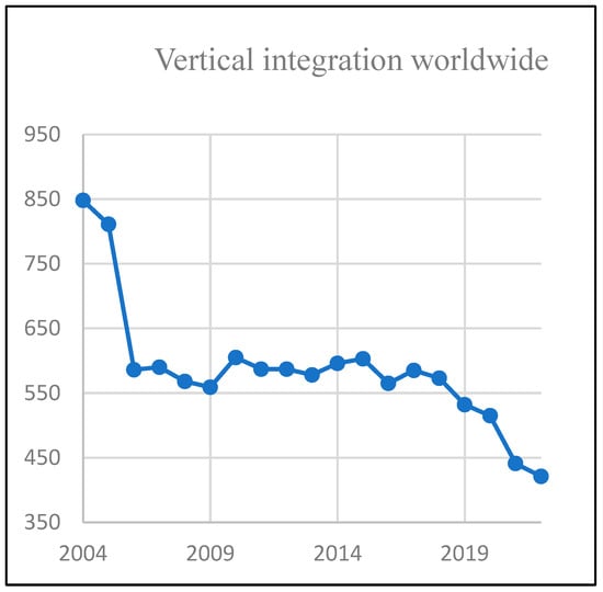 Much of the previous research suggests that new industries generally have a strong representation of vertically integrated firms [,], and over time, industries have tended to disintegrate as integrated firms split into specialized firms and new specialized firms entered [,]. Many industries originated from a technological innovation []. When such innovation is systematic, according to Teece, it requires adjustment and alignment of activities and investments at different stages of the vertical chain []; thus, it can be difficult for buyers and suppliers to use market transactions (including contracts, as pointed out by Williamson in 1985 [].