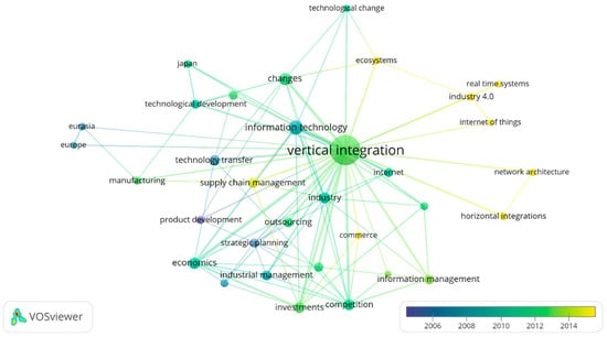 The use of bibliometric tools has increased significantly and is now a current way of interpreting the literature and research trends []. In this section, the key concepts that most relate to the theme in the last 22 years are identified. Using the VosViewer tool, the concepts were mapped to the totality of the sample data. The result of this mapping was translated into a visualization of a bibliometric network, which presents an easy-to-understand map of the most frequently occurring key-words related to the term vertical integration and the relationship between them. This tool supports distance-based maps, where the distance between two points/terms identifies the relationship between them, i.e., distant concepts point to a weak relationship and close concepts point to a strong relationship (i.e., frequently linked terms). This analysis is presented in the following figure.
