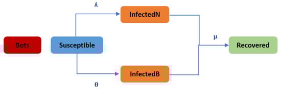 - The total population is divided into five groups: the susceptible nodes (s), the normal infected nodes , the bot-infected nodes , the bot nodes (B), and the recovered nodes (r).