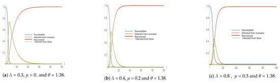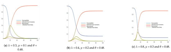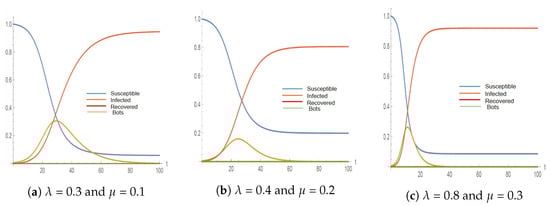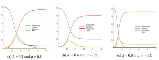 Figure 6 and Figure 7 show how the number of infected nodes changes by using different infection and recovery rates ( and ) across the classical SIR model and the model.