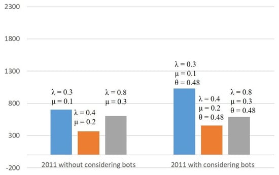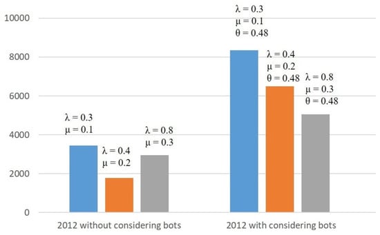 It can be concluded that the classical SIR model is far from reality, as it neglects the bot accounts and the fact that they remain infected and never recover. It does not reflect the diffusion process of the real datasets. In the 2011 and 2012 datasets, the total number of infected accounts was 2300 and 11,219, respectively, whereas the SIR model simulation gives 704 for 2011 and 3448 for 2012, which represents about 31% of the real number of infected accounts. These numbers have been achieved with the best-fit rates.