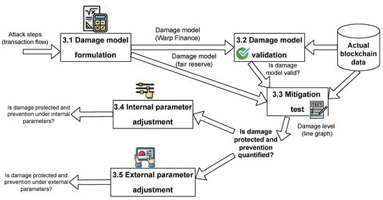 As depicted in Figure 1, the FAA framework consists of five main processes. (Section 3.1) Damage model formulation: this process converts attack steps (e.g., flowchart, transaction steps, or text description) to a damage model. Additionally, it defines a core sub-model, which is a plugin of the damage model. The core submodel represents a mitigation model, such as the LP token price calculation in the Warp Finance case. (Section 3.2) Damage model validation: the damage model is validated using the blockchain data snapshot when the system was under attack. (Section 3.3) Mitigation test: the mitigation model is plugged into the core submodel. Then, it is tested using the same blockchain data snapshot as in the previous step. The output from this process provides quantitative results indicating the efficiency of the particular attack prevention techniques. Here, the outcome is vital to measure the efficiency of the prevention techniques. As some prevention methods can protect platforms in specific cases only, the next processes are necessary for uncovering hidden risks. (Section 3.4) Internal parameter test: the internal parameters are the parameters of the protocols that can be adjusted, such as the collateral ratio, slippage tolerance, liquidation, and incentive values. In this process, protocol parameters are dynamically adjusted to test the damage and mitigation models. (Section 3.5) External parameter test: the external parameters refer to values that do not depend on the protocol, such as token prices, market conditions, and trading volumes. The impacts of external parameters are derived from the actual blockchain data. To uncover hidden risks, damage models are simulated under the conditions of internal and external parameters, and a risk report of the protocol is generated based on variations of the parameters. The risk report consists of system damages and prevention quantity under the internal and external parameters. As a result, developers can simulate the damage and protection level of the prevention strategy based on various internal and external parameter settings; hence, the DeFi protection can be maximized. The detailed steps of the process are described in the following sections.