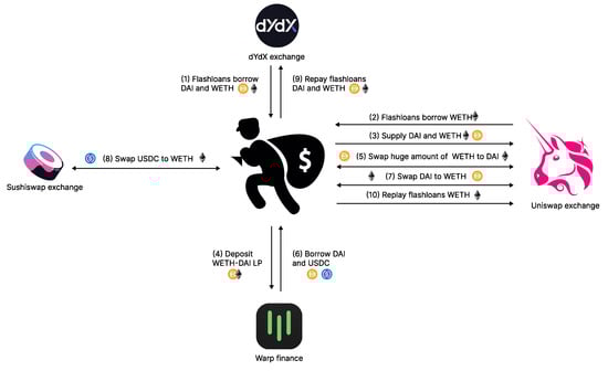 - Warp Finance. Warp Finance. 2020. Available online: https://warpfinance.medium.com/warp-finance-exploit-summary-recovery-of-funds-5b8fe4a11898 (accessed on 12 September 2021).
