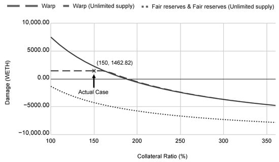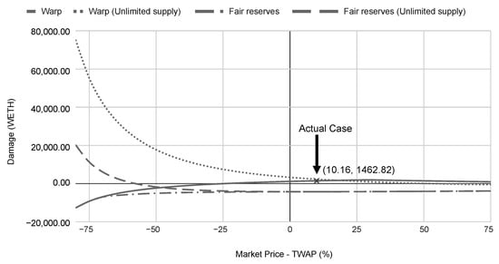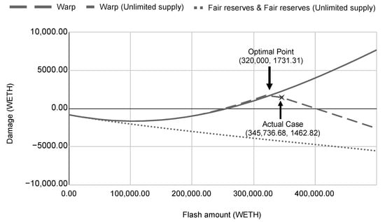 With the baseline variables in Table 1, the models in Section 3.1.1 and Section 3.1.2 can be executed and compared with the actual case. The damage model constructed in Section 3.1 takes inputs ( and c) from the attack flow. Let denote the output, which is the damage to the DeFi platform. We substitute actual blockchain states into the damage model in Equation (20). We obtain the result shown in Table 2, column Standard.