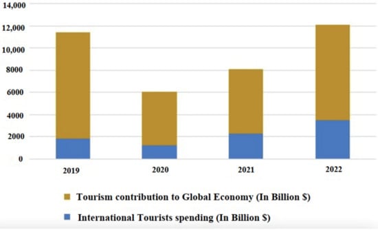 Before the pandemic outbreak, the travel and tourism industry was responsible for over one in four new jobs worldwide [6]. The overall contribution of tourism to the global economy and international tourist spending (2019–2022) is shown in Figure 1 [7,8,9,10].