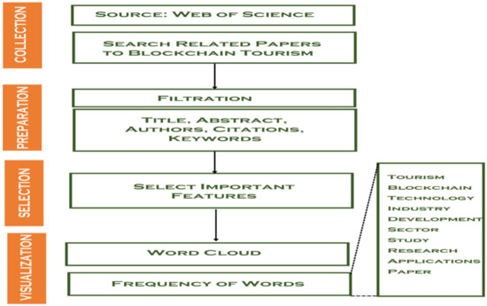 For this study, we adopted the following architecture to identify the most frequent words used in the published blockchain in tourism indexed in the Web of Science database. We used a combination of text analysis, text extraction, and text classification using AI models [86]. Figure 2 represents the architecture of this research. The proposed architecture is categorized into four different parts: