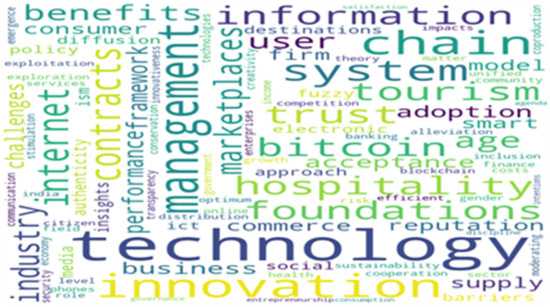 As in Figure 7, blockchain, technology, and tourism are the most frequently used in the title. However, there is a minor difference in the frequency of words used in Figure 7 and Figure 8. In the analysis, the words are almost similar for title and abstract; only the frequency of the expression is shuffled. In Figure 4 and Figure 7, the highest frequency is “tourism”, and the second most frequent word is “blockchain”. Similarly, Figure 5 and Figure 8 show that the highest frequency word is “tourism”, followed by “blockchain”. The frequency of words in titles shows what the terms present and their frequency. It will give an idea of how the researchers make the titles.