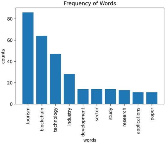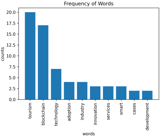 Researchers used N-gram to identify the most frequent words [92,93]. The N-gram model predicts the occurrence of a word based on its N-1 previous work [94]. Figure 7 and Figure 8 represent the word frequency analysis. Figure 7 illustrates the most frequent words in the “title” section. The most frequent terms in the titles are blockchain, tourism, and technology. Afterward, adoption and industry are used.
