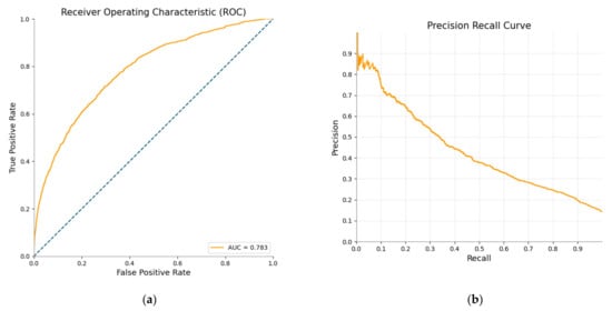 Receiver operator characteristic and precision-recall curves: (a) receiver operator characteristic curve for XGBoost classifier; (b) precision-recall curve for XGBoost classifier.