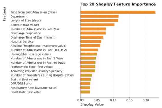 We also applied SHAP feature importance to highlight the top 20 importance features in our training data. The plot can be seen in Figure 4. These include a mix of utilization (e.g., length of stay, number of admissions in the past year), disposition (e.g., discharge disposition, admitting department or hospital service), laboratory (e.g., last albumin or sodium value, first prothrombin time), and vitals-based features (e.g., average respiratory rate, last heart rate).