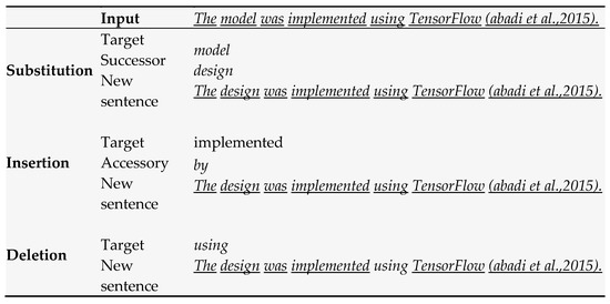 A successor is a substitute or additional text unit that will be included in a sentence. The source used to obtain the successor was obtained from the language model with the word embedding approach. This language model was created using word2vec [48] with a corpus as a source for scientific papers collection. Word2vec has two models, namely CBOW and Skip-Gram. CBOW allows performing successor search processes for substitution and insertion actions. Meanwhile, the skip-gram was not used because it could not find the successor for the insertion action. The cosine similarity Formula (1) is used to determine the successor in the substitution action by comparing the target vector with the candidates in the word2vec dictionary. Meanwhile, the probability vector Formula (2) is used to determine the successor by comparing the neighbor word vectors from the target position with the candidates in the word2vec dictionary.