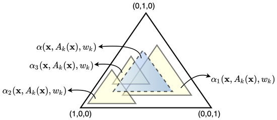 We have a mixture of M contamination models with the different contamination parameters . It is obvious that the sum of new weights over is 1 because the sum of each over is also 1. Each forms a small simplex so that its center is defined by and its size is defined by . The corresponding sets of possible attention weights are depicted in Figure 2, where the unit simplex by includes small simplices corresponding to three () contamination models , , with different centers and different contamination parameters . The “mean” simplex of weights is depicted by using dashed sides. Parameters are optimized so that the attention weights will be located in the “mean” simplex.