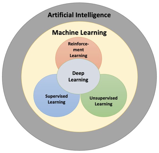 Schematic representation of the relationship between artificial intelligence (AI), machine learning, reinforcement learning, and deep learning.