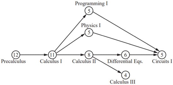 The design pattern shown in Figure 6 is one that many aspiring engineering students are asked to follow for the traditional Circuit I course. Precalculus becomes the most important course in the pattern due to its placement in the pattern. Each course in a curricular pattern contributes learning outcomes that are necessary to go through subsequent courses in the pattern, while some courses offer extra learning outcomes that are not necessary to complete the pattern (though they might be required in other parts of the curriculum). Hence, as long as all of the relevant learning outcomes needed to attempt the Circuits I subject occur in prerequisite courses, we can modify the order in which these objectives are attained.