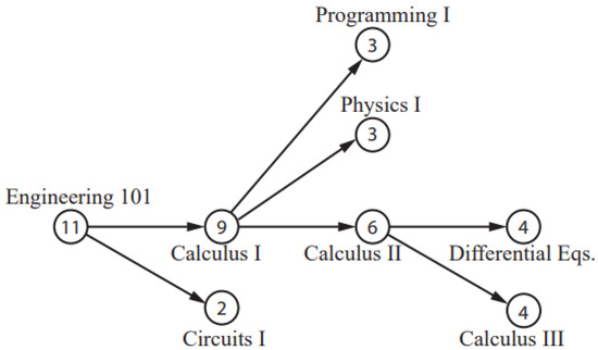 In the literature, there are numerous definitions of student achievement. Most studies view graduation as the ultimate indicator of student achievement, although these factors might range from grades and perseverance to self-improvement [81]. The framework shown in Figure 5 is possibly the most typical one employed by colleges in the US when examining the elements influencing student achievement. Pre-institutional encounters, institutional circumstances, and student actions can be used to segment these characteristics into three broad categories [82,83]. Student growth will be facilitated by providing institutional settings that matter, but there might also be structural issues with the curricula that prevent advancement without reference to any success initiatives. The organization of the courses in a curriculum, such as the number of courses and prerequisites, determines the structural complexity of the curriculum. In contrast, a curriculum’s instructional complexity is defined by the course’s inherent difficulty, the caliber of the teacher, academic assistance, etc. These two factors define how challenging a curriculum could be. Graph theory and complex network analysis are employed to give a mathematical framework to identify essential courses. This may assist the university in deciding when to offer particular programs, who should teach them, and what is actually required for a degree in a particular discipline. The proposed method gives a strong framework to ensure that students may easily go through courses with the aim of increasing a university’s graduation rates. A course is considered critical if the student cannot or does not take it at the appropriate time, thus failing to complete the course by the scheduled time. Therefore, it would be imperative to transfer these courses to the earliest terms while still adhering to the requirement relationship restrictions, maximum and minimum academic loads per term, maximum and minimum credit hours per term, etc. Pivotal courses have a significant influence on university student advancement and, eventually, graduation rates. Therefore, finding such courses should be a top priority for university decision makers. The blocking factor and delay factor are two key characteristics that relate to the cruciality of a course within the network [80]. The blocking factor of a course is the total number of classes that students are restricted from enrolling in until they successfully complete it. The delay factor of a course is the total number of prerequisite courses on any pathway that contains that course. In [79], an MDP was used for modeling curriculum analytics. The research provides a mathematical model that supports instantaneous what-if evaluations connected to curricular modifications rather than waiting years to assess the influence of curriculum changes on student progress.