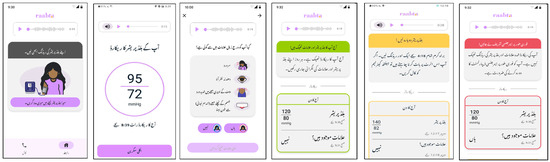 The patient-facing technology includes the Raabta smartphone application (app) and Bluetooth-enabled blood pressure device that is validated for use in pregnancy. The app enables pregnant women to take daily blood pressure readings at home with a provided Bluetooth-enabled home blood pressure monitor and to answer one yes/no symptom question. The app provides automated alerts (i.e., self-care messages) to women based on the entered data. The app uses a rules-based algorithm, which was developed using NICE guidelines [24] and through consultations with expert clinicians. The algorithm includes settings to trigger alerts and self-care messages for high-risk pregnant women with or without antihypertensives and symptoms of preeclampsia such as taking additional blood pressure readings, calling the clinician (medical officer and/or midwife/research nurse), visiting the OB-GYN emergency department, etc. Other features of the Raabta app include the use of the local language (Urdu), illustrations for daily symptom monitoring questions (for pregnant women who cannot read), an easy-to-understand green–yellow–red alert system that uses the well-known traffic lights analogy, and voice message alerts in conjunction with the text. All these features and functionalities were incorporated to ensure that the Raabta app is culturally aligned and relevant. The features of the technology have been informed by our previous needs assessment study with pregnant women at HRPE and their caregivers [10,11]. Figure 1 displays various screens from the Raabta application.