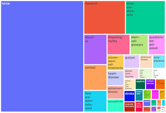 Table 7 lists five examples of viewed categories of web pages to illustrate the use of a path segment analysis. It could be seen that the home page (named “home” in the table) attracted the greatest number of views. Thanks to the meaningful organization using the path components of web addresses, it could be identified that some areas of the website, such as “research” and stem cell information (i.e., “how-are-stem-cells-used” and “what-are-stem-cells”), gained hundreds of visits. Additionally, the full set of page views data can be visualized using a Treemap diagram as shown in Figure 2. With the visualization, we could evaluate that the home page received almost half of the traffic. Apart from the home page, other topics like “research”, “what-are-stem-cells”, “about-us”, “dispelling-myths”, etc., should receive more attention from the web administrators because of their relatively high number of views. The interactive version of this Treemap (not included in the manuscript) could be used to identify web page categories with the least traffic (i.e., the smallest rectangles at the bottom-right corner).