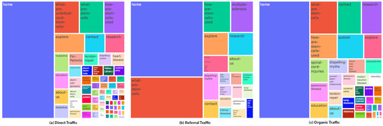 Treemap visualizations of (a) direct; (b) referral; and (c) organic traffic.