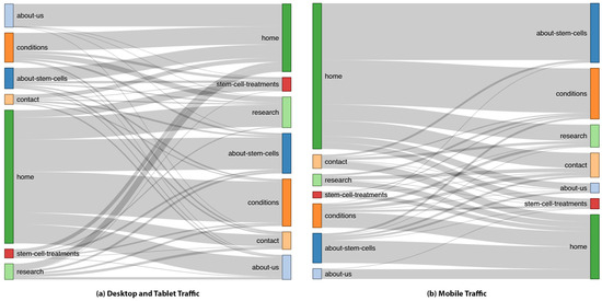 Figure 5 presents the twisted visualizations that illustrate the complicated navigation flows. In both sub-figures (a) and (b), there was a substantial amount of traffic flowing into the “home” category, suggesting that users returned to the home page and restarted information seeking. As shown in Table 9, the percentage of traffic returning to the home page ranged from 39.8 to 97.2% on desktops and tablets, and 47.8 to 95% with mobile traffic. These patterns demonstrated a kind of typical behavior of looking for extra information by going back to the home page and following other links. This visualization can also help researchers to understand what categories of information users follow up with after reading a certain type of information. For example, “stem-cell-treatments” were connected with “research” in the visualization, suggesting that these two categories of information were often browsed one after another. In addition, the visualization placed both the charts of desktop and tablet traffic (Figure 5a) as well as mobile traffic (Figure 5b) side-by-side, so that the traffic flows of different types of users could be compared. An observation was that more mobile traffic arrived at the home page initially and more of these users navigated to “about-stem-cells” and “conditions” next. In sum, both desktop and tablet and mobile traffic showed a high ratio of users going back to the home page after reading other categories of information.