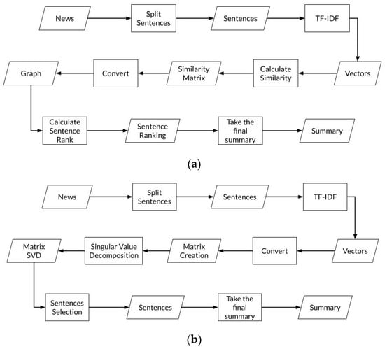 The flow of the two text summarizations methods: (a) TextRank, (b) LSA.