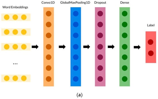 CNN is a multilayer network, and, therefore, the output of a layer becomes the input to the next layer. It is usually comprised of an input layer, one to several hidden layers, and an output layer. There are several types of layers that are present within a CNN []. The raw input to the network is contained in the input layer, while the convolution layer is in charge of calculating the output volume by performing dot product operations between all of the filters and image patches. This model has been used to solve a variety of image processing and automated NLP problems, including opinion analysis, question answers, and text analysis [].