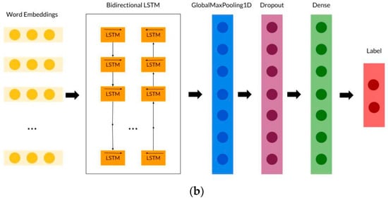 Other studies compared several deep learning methods for text classification to determine the model with the best performance. Fouad [] investigated and assessed the performance of various deep learning models for detecting Arabic fake news. They evaluated five different deep learning models, namely, CNN, LSTM, BiLSTM, CNN + LSTM, and CNN + BiLSTM. Ramya [] proposed a deep-learning-based fake news detection system using CNN, LSTM, and BiLSTM. They evaluated the models’ performance based on accuracy, precision, recall, and F1 score using a complex problem dataset called LIAR, and performance analysis was performed on each of the LIAR dataset’s training, validation, and testing sets. Asghar [] explored the use of various deep learning models for the detection of rumors on Twitter. The proposed system was shown to effectively classify tweets into rumors and non-rumors using BiLSTM and CNN. Bidirectional long short-term memory (BiLSTM) is a type of recurrent neural network (RNN) that is well-suited for sequential data processing such as NLP tasks. Long short-term memory (LSTM) is a specific type of RNN designed to address the vanishing gradient problem and capture long-term dependencies in sequential data, while a convolutional neural network (CNN) is a type of neural network originally developed for image processing tasks that has also been successfully applied to text and sequential data.