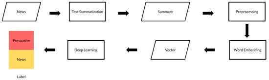 Figure 3 shows the proposed model used to detect persuasive news. The method we have developed represents a breakthrough in this domain. We combine text summarization, word embedding, and deep learning to create an algorithm capable of automatically identifying persuasive news with a high degree of accuracy. We utilize text summarization as an initial step to summarize and identify the core of the news, considering that persuasive elements can be embedded in just a few sentences. Subsequently, we apply deep learning for accurate classification, distinguishing whether the news contains persuasive elements or not.